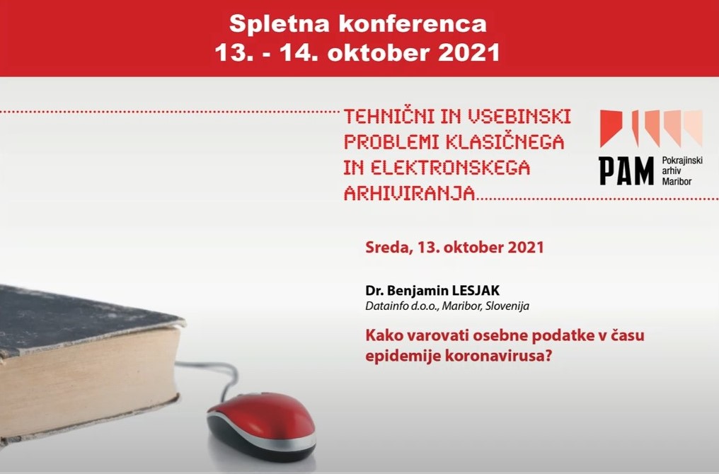 Med 13. in 14. oktobrom je potekala mednarodna konferenca z naslovom Tehnični in vsebinski problemi klasičnega in elektronskega arhiviranja. Na njej je na temo »Kako varovati osebne podatke v času koronavirusa?« predaval tudi dr. Benjamin Lesjak. Predavanje je dostopno na povezavi: https://www.youtube.com/watch?v=4_TxOayCUzM&list=PL8KwIBQ8ryXwWeaFQEbjZYtGRtrhAvi7c&index=2